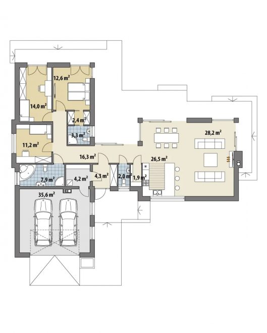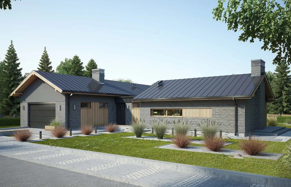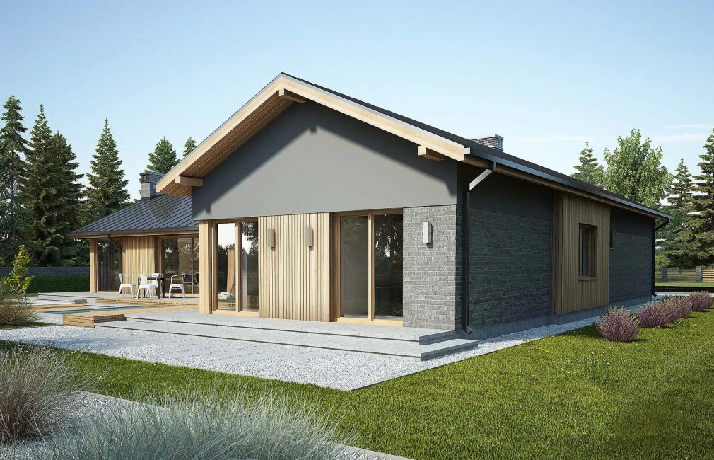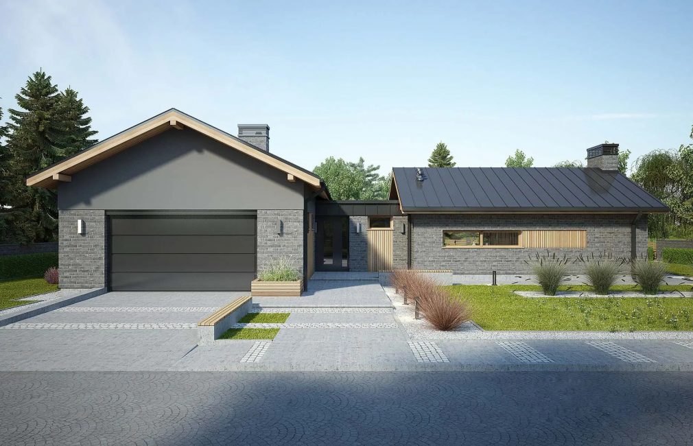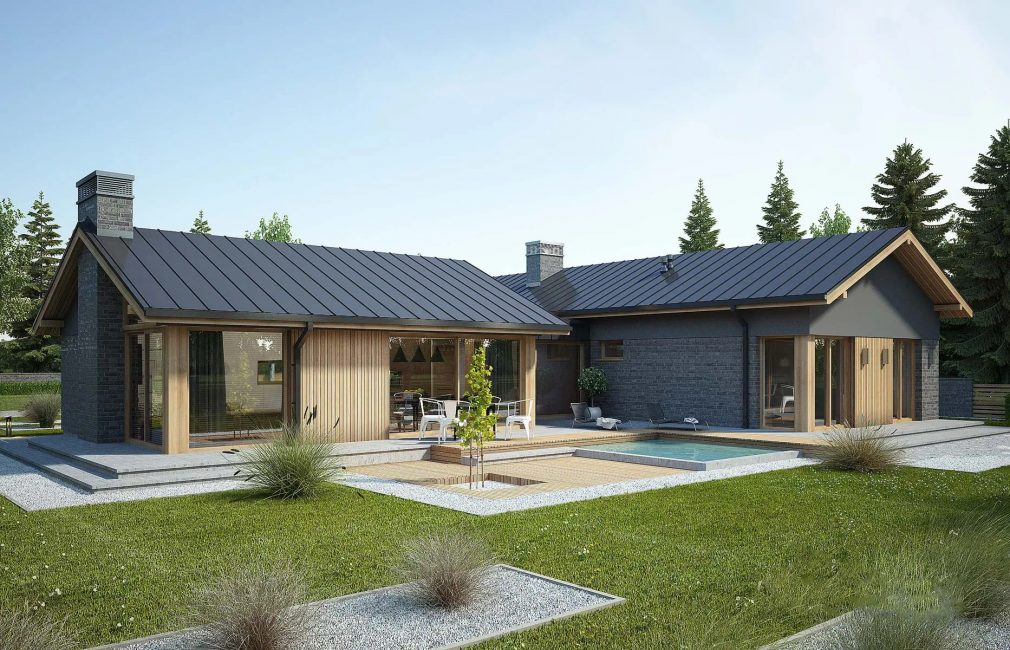 Одноэтажный коттедж на одну семью из 4 человек, как и современный загородный одноэтажный дом AET-009, выполненный в американском стиле. Дом имеет оригинальную Т-образную планировку, которая позволяет создать на участке уютный внутренний дворик.