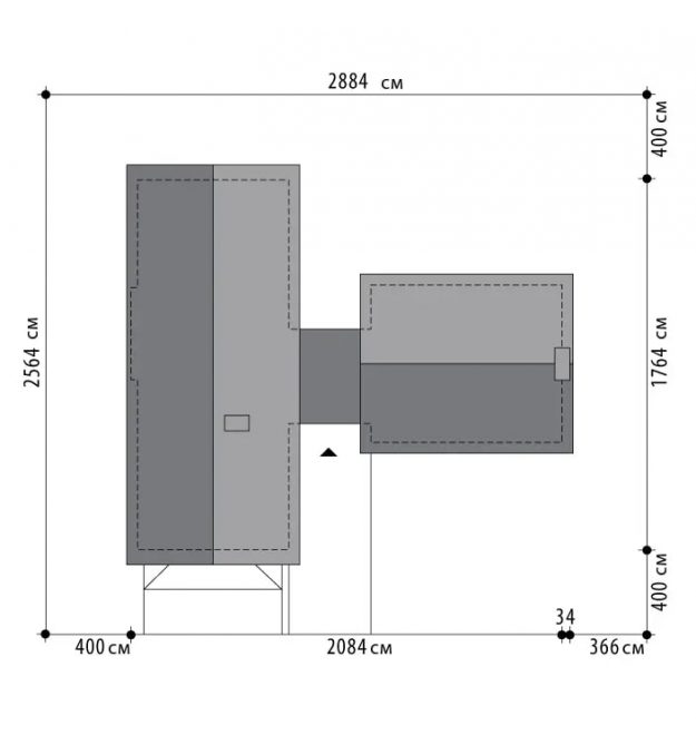 Постройка имеет четкое разделение на три флигеля. Первый — так называемая дневная зона. Она отличается обширной площадью остекления. Каждая из стен этого флигеля имеет либо окно, либо прозрачную дверь. В этом жилом пространстве находится большая гостиная, где есть место для двух диванов, журнального столика и обеденной группы на 6 человек. Украшением этого помещения является камин, который имеет общую дымоходную шахту с печью, стоящей на террасе.