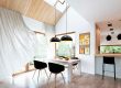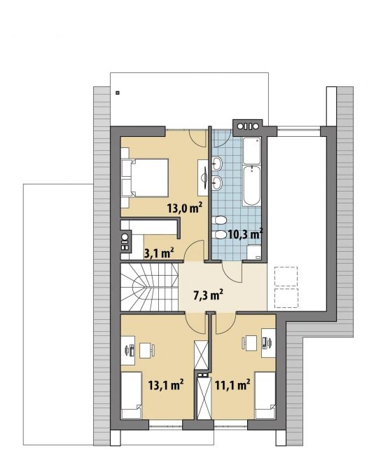 На второй этаж ведет удобная двухмаршевая лестница. Мансарда же включает в себе две спальни для детей и одну — для родителей, а также большую ванную комнату. В ней достаточно места, чтобы поместились ванна, душевая кабина, унитаз, биде и две раковины, а еще стиральная машина и сушильный автомат. При желании из этого помещения площадью более 10 м2 можно сделать два отдельных санузла.