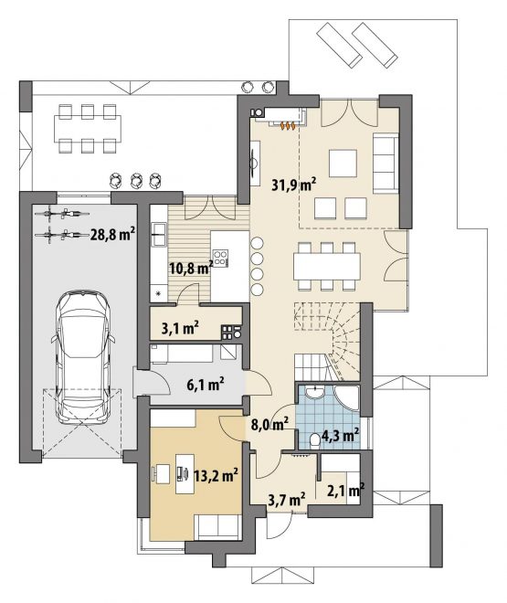 Также на первом этаже проектом предусмотрены гардеробная комната, санузел, гараж на один автомобиль, примыкающая к нему котельная, и жилая комната, которая может быть как спальней, так и кабинетом с большим рабочим столом, диваном и шкафом для книг.