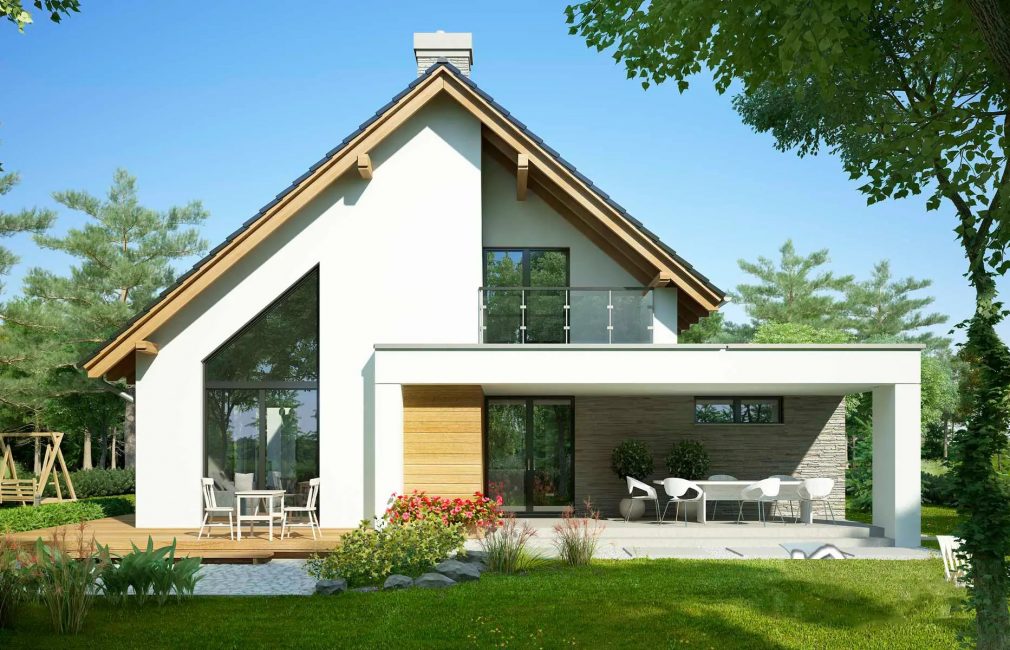 Этот просторный двухэтажный особняк являет собой симбиоз классического и современного стилей. Традиционная постройка с двускатной крышей отличается большой площадью остекления, причем окно гостиной имеет оригинальную треугольную форму, вторя линиям скатов.