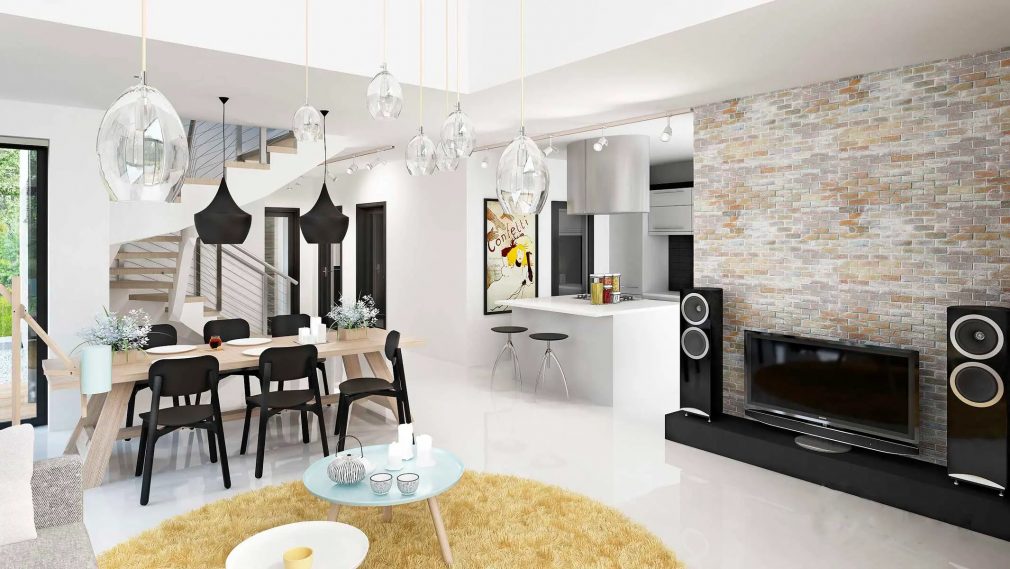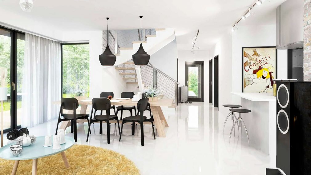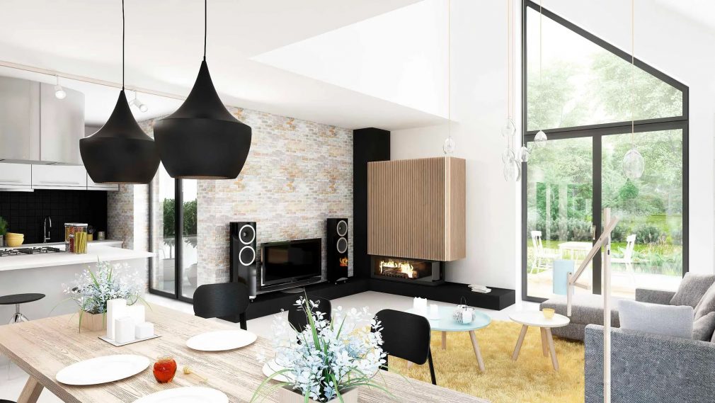 Дом рассчитан на семью из 4-5 человек. На первом этаже находится просторная гостиная со вторым светом. Здесь достаточно места для дивана, двух больших кресел и камина. Обеденная группа, размещенная в эркере, позволяет собрать за столом 6-8 человек.