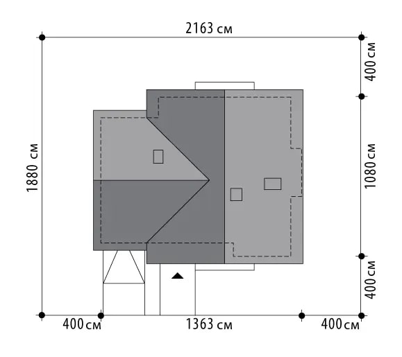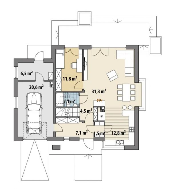За входной дверью находится холл, из которого можно выйти в гараж, рассчитанный на одну машину (слева), и кладовую, ведущую в кухню (справа).