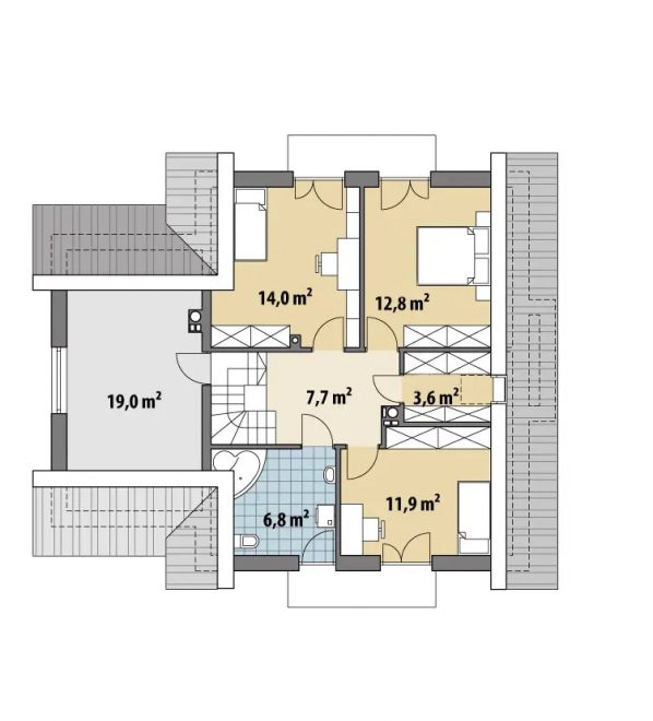 Мансардный этаж включает в себя три спальни, санузел, гардеробную и ванную комнату с выходом на балкон.