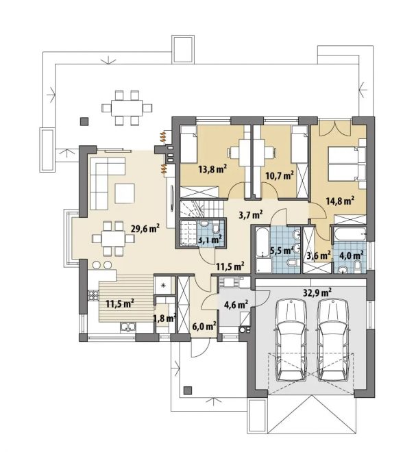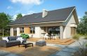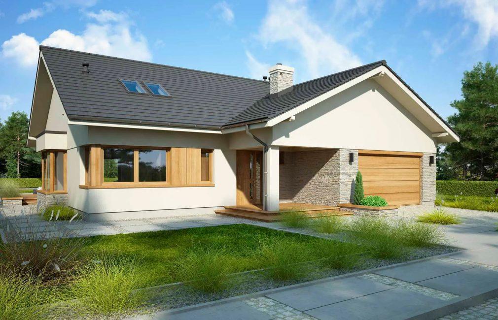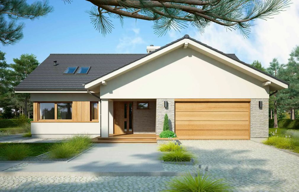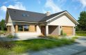 Этот односемейный дом, рассчитанный на 4-6 человек, может быть как одно-, так и двухэтажным. В базовом варианте на первом его этаже находится гостиная с эркерным окном, столовая, кухня и небольшая кладовая. Кроме того, проектом предусмотрены три спальни (одна большая и две малых), гардеробная, три санузла, котельная и большой гараж на два автомобиля.