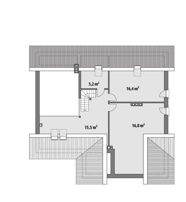 Что же касается второго этажа, в зависимости от желания заказчика он может стать чердаком или жилой мансардой с тремя большими комнатами и (опционально) еще одним санузлом.