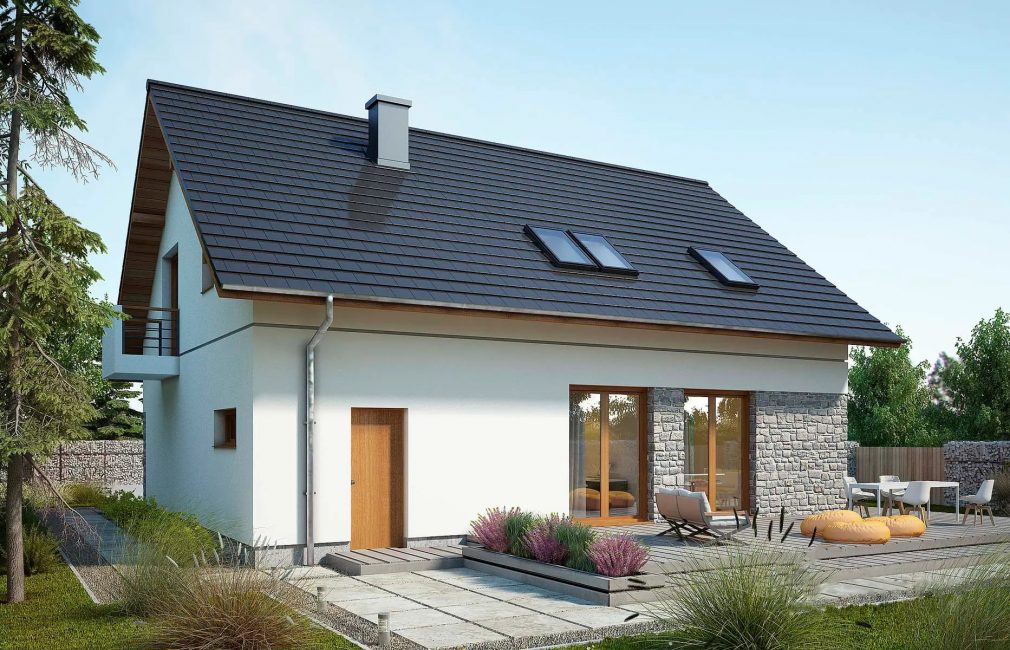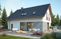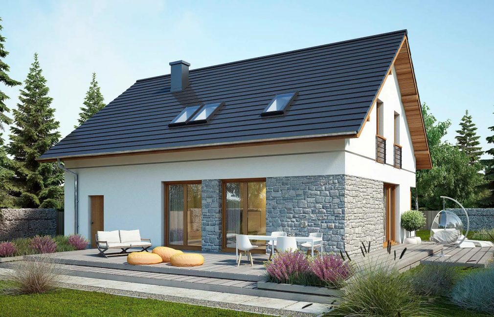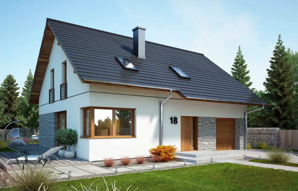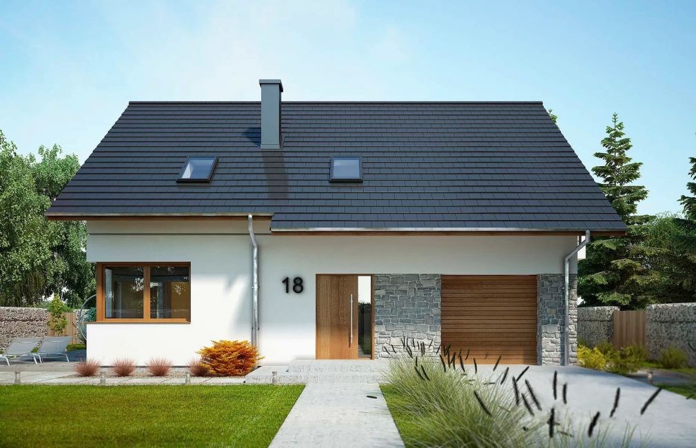 Односемейный дом на 5-6 человек, выдержанный в классическом стиле — белый оштукатуренный фаса и каменная облицовка, которая по желанию заказчика может быть заменена на планкен или плитку под кирпич. На первом этаж находится гостиная со столовой группой и кухня площадью почти 10 м2, возле которой стоит главное украшение интерьера — угловой камин. Еще одно достоинство этой зоны — большая площадь остекления. В кухне хозяйку порадует угловое окно, которое позволит наслаждаться видами во время кулинарных таинств. В гостиной же есть две огромные светопрозрачные двери, ведущие на террасу. Любителям классического стиля можем предложить еще вариант AET-004.