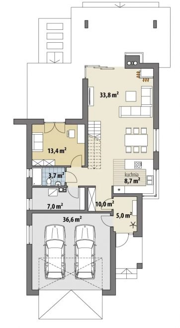 Для гостей на первом этаже предусмотрена отдельная комната с примыкающей к ней ванной комнатой. Она имеет отдельный выход в сад, так что приглашенному обеспечена приватность, комфорт и возможность отдыхать, не стесняя хозяев. Кстати, в доме предусмотрен гараж на две машины, так что с парковкой тоже не возникнет проблем.