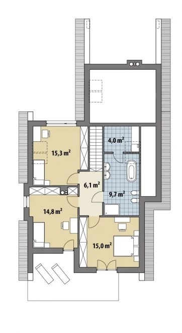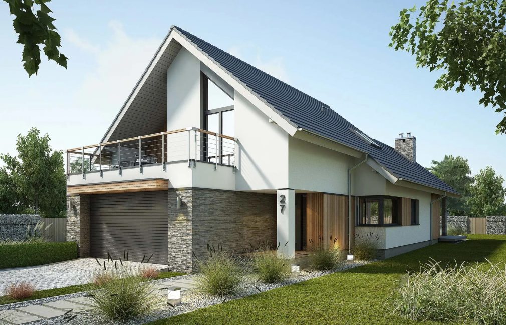 На второй этаж ведет одномаршевая лестница, пространство под которой можно использовать как шкаф или мини-кладовую в дополнение к той, что находится возле кухни. Мансарда же включает в себе две спальни для детей, одну — для родителей, а также большую ванную комнату. Она в ней достаточно места, чтобы поместились ванна, душевая кабина, унитаз, биде, раковина, а также стильная машина и сушильный автомат. Более того, площадь позволяет обустроить тут финскую сауну или хамам.
