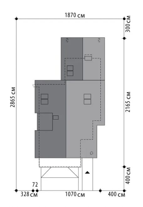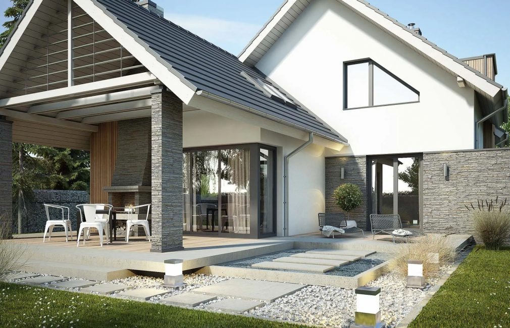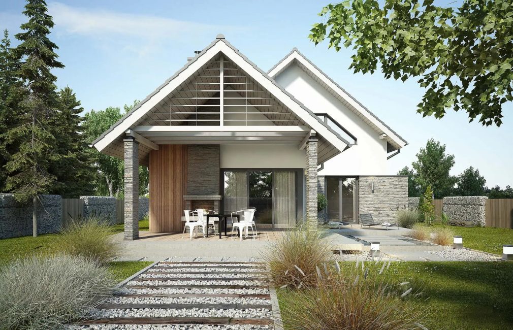 Первый этаж (дневная зона) включает в себя кухню, кладовую, столовую, и гостиную со вторым светом — большим окном в верхней части стены, которое добавляет ей света и ощущения простора. Из этой комнаты на террасу ведут стеклянные двери. Там, под двускатной крышей с ажурным декором, обустроена площадка для отдыха на свежем воздухе