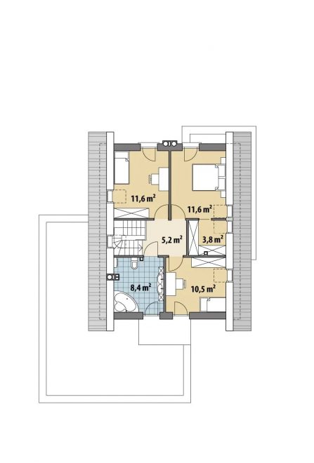 Второй (мансардный) этаж — это частное пространство владельцев дома. Здесь находятся три спальни, причем одна из них имеет отдельный гардероб, и большая ванная комната с выходом на балкон. Если Вас интересуют дома с мансардным этажом, рекомендуем обратить внимание на каркасно-панельный двухэтажный дом AET-001.