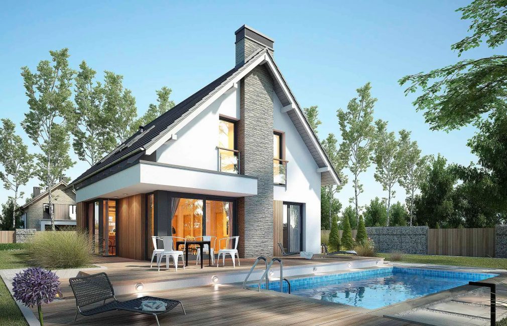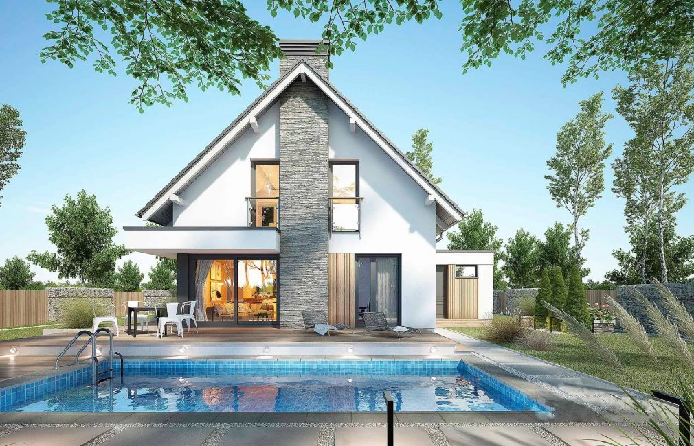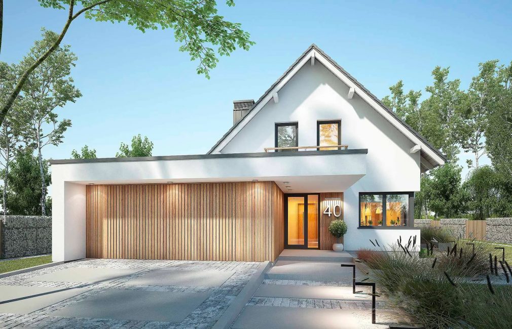 Дизайн дома — лаконичный, но не лишенный оригинальности. Белая штукатурка эффектно контрастирует с серыми рамами окон, короб дымоходной шахты облицован плиткой, имитирующей дикий камень, а вертикальная отделка планкеном превратила гараж из сугубо утилитарной пристройки в украшение проекта.