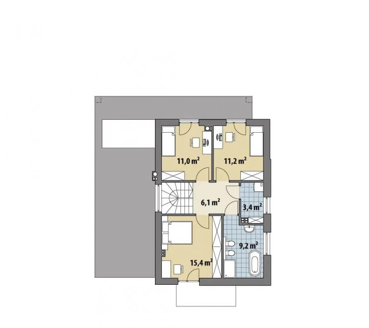 На второй этаж ведет удобная двухмаршевая лестница. Здесь организована ночная зона, она же — приватное пространство хозяев дома. Это три спальни, ванная и постирочная. Все комнаты имеют большие окна, позволяющие в полной мере насладиться видами, а из большой спальни можно выйти на балкон.