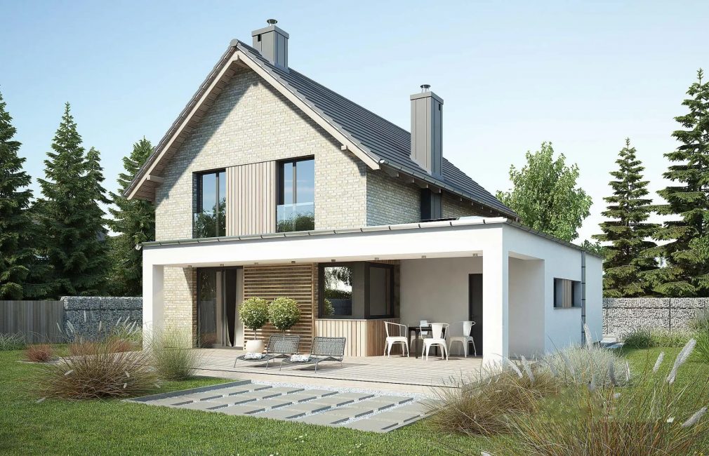 В этом доме четыре спальни и три санузла, так что даже большая семья 5-6 человек будет чувствовать себя в нем вполне комфортно. Первый представляет собой так называемую дневную зону. Прежде всего это большая гостиная-столовая с камином. Учитывая, что все дома от AET-HOME являются энергоэффективными, то есть практически не теряют тепло, этот отопительный прибор станет хорошим подспорьем в холодную зиму.