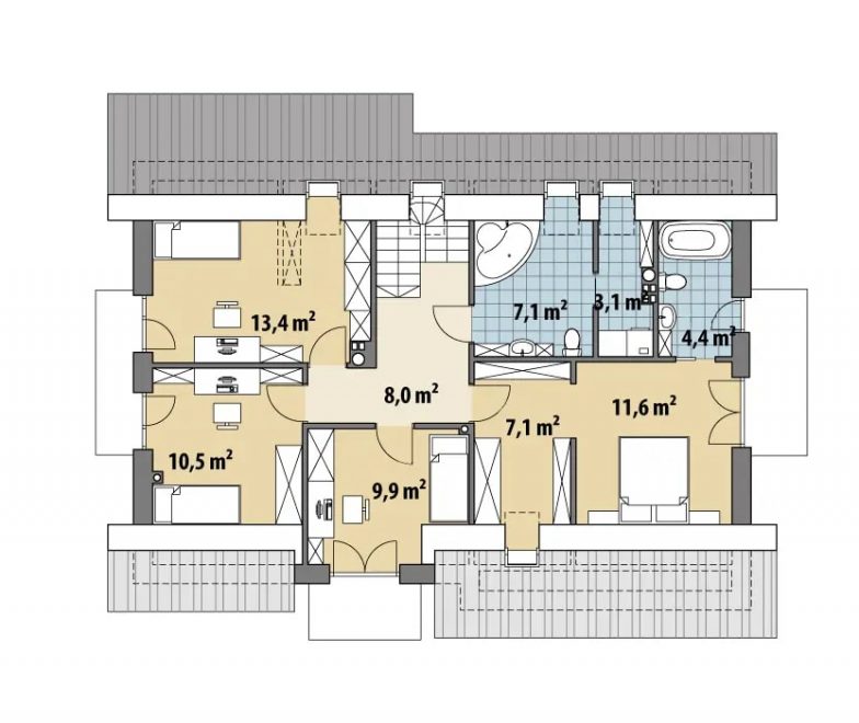 Второй этаж — ночная зона — удивляет своей вместительностью. Тут находятся четыре спальни, одна из которых — с отдельной гардеробной, а также два санузла и постирочная, причем все три эти помещения имеют окна. А обилие дневного света — это не только красиво, но и выгодно в плане экономии на электричестве. Но этим выгода не ограничивается.