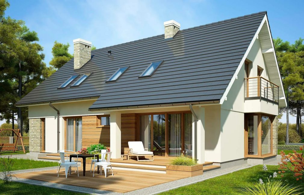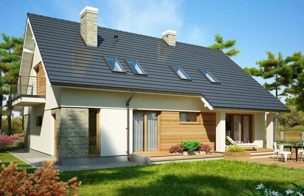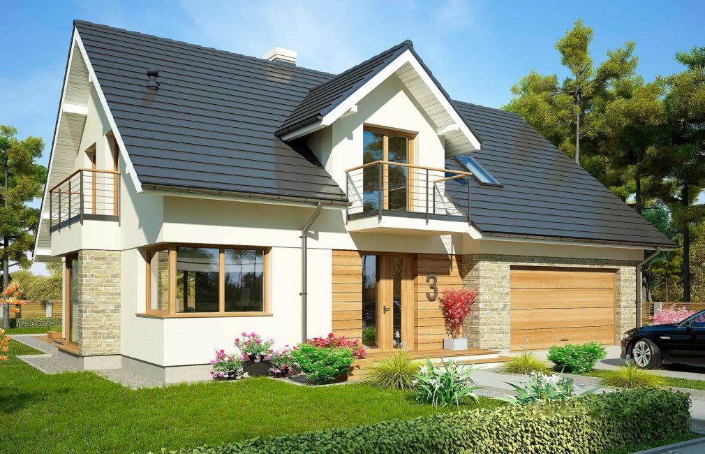 Это двухэтажный дом для семьи из 5-6 человек, любящей простор, респектабельность и комфорт. Он отличается продуманной рациональной планировкой. Так, балкон второго этажа является одновременно навесом над входной зоной, защищающем крыльцо осадков. Из прихожей, куда можно поставить пару шкафов, есть выход в гараж на два автомобиля и примыкающей к нему котельной. У нас так же имеются и другие проекты с гаражом на два автомобиля, например, каркасно-панельный дом AET-005