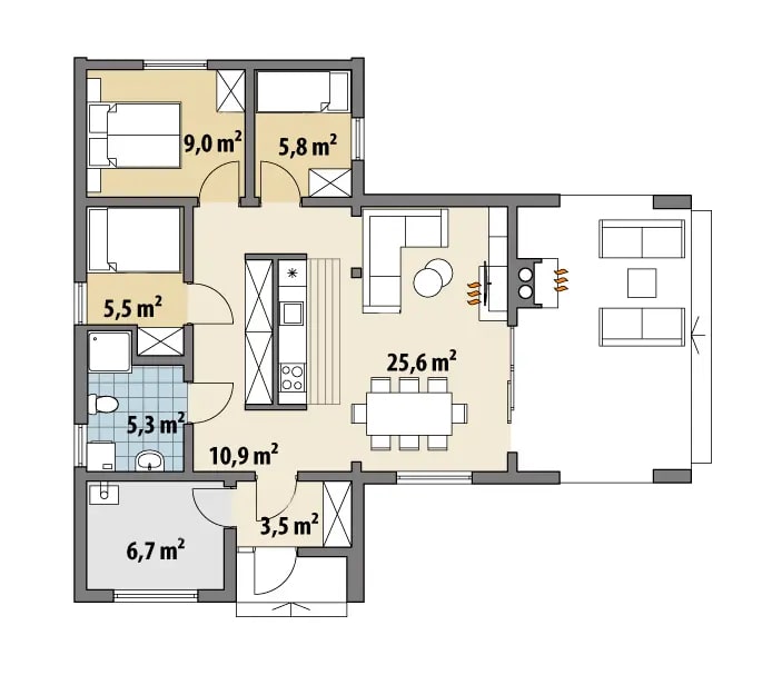 В ночной зоне три спальни — одна большая (9 м2) и две поменьше. И конечно, проект предполагает наличие санузла — помещения площадью 5,3 м2, с душевой кабиной и нишей под стиральную машину.