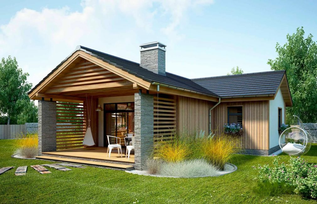 Дом имеет большую террасу, сопоставимую по площади с гостиной, защищенную от солнца крышей сверху и жалюзи по бокам.