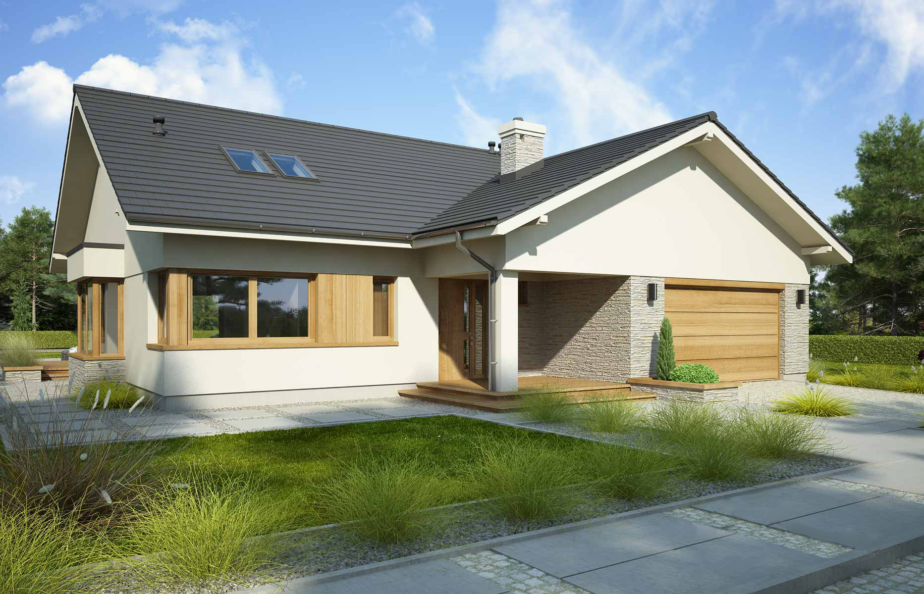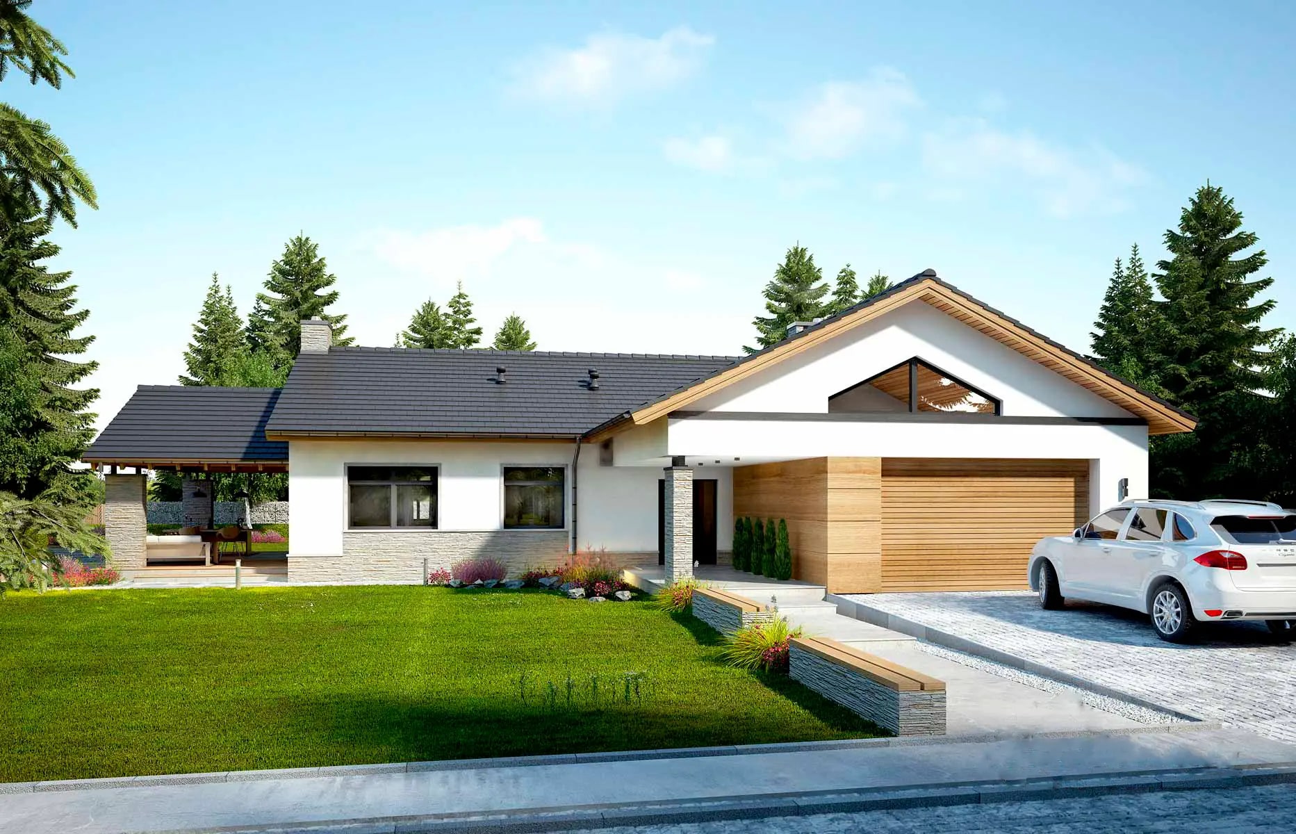 Широкая крытая терраса идеально подходит для приятных вечеров. Здесь же можно увидеть «изюминку» данного проекта — двойной очаг. Снаружи дома стоит печь с открытой топкой, а внутри, в гостиной — кассетный камин, эффективно отапливающий помещение. Эти устройства объединяет декоративный короб, в котором проходя два изолированных дымохода.