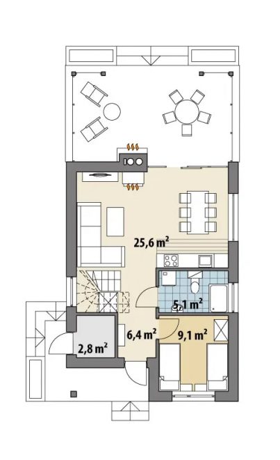 Площадь дома относительно мала — всего 78,5 м2. Но как ни удивительно, в нем могут вполне комфортно разместиться 3-4 человек, и даже найдется место для гостей. Достичь этого удалось благодаря тщательно продуманной планировке. На первом этаже находятся гостиная, где можно поставить Г-образную диванную группу и столовая, совмещенная с кухней, вмещающей все необходимое для кулинарии. Также здесь расположена малая спальня для двух человек, санузел с ванной и душевой кабиной, и небольшая подсобка, имеющая отдельный выход снаружи дома. Это наверняка понравится садоводу-огороднику, который может держать там инвентарь, и брать его, не заходя в жилое пространство в грязной обуви. Так же можем предложить вам компактный одноэтажный дом для небольшой семьи — AET-018.