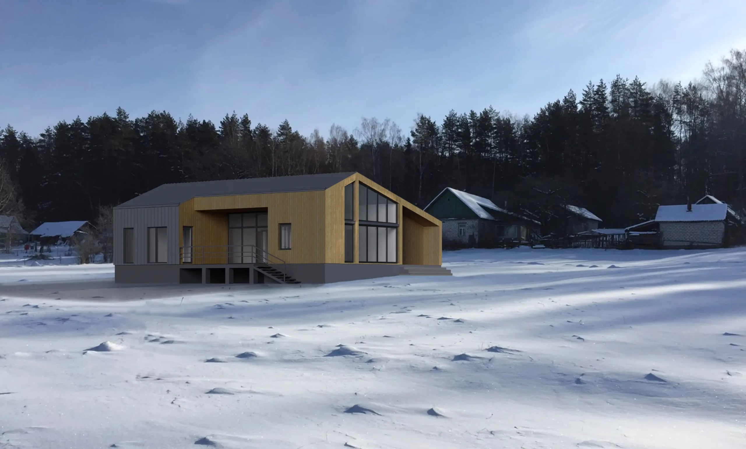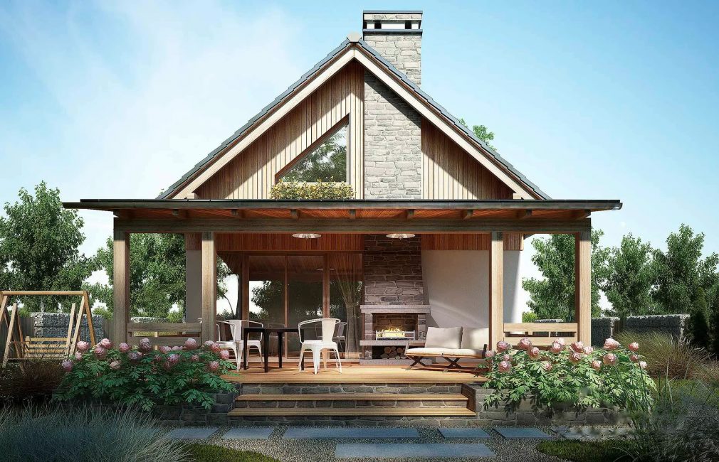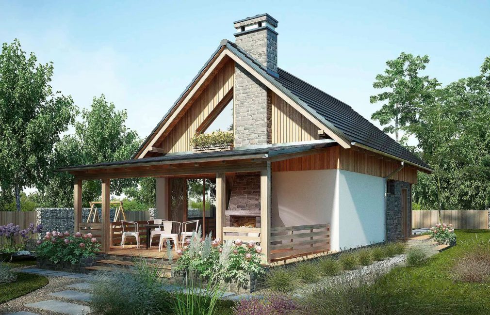 Этот дом скромных размеров прекрасно подойдет для стандартных шести соток, особенно если участок имеет сложную для планировки вытянутую форму. Постройка рассчитана на двух человек, которые приезжают на дачу по выходным или живут за городом постоянно.
