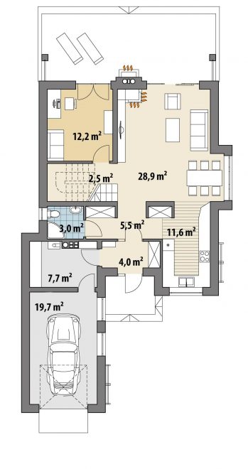 Площадь дома относительно невелика — всего 163 м2. Но при этом он вмешает в себя все, что нужно для комфортного проживания семьи. Так, на первом этаже находится кухня, гостиная, совмещенная с столовой, просторная (более 11,6 м2) кухня, и жилая комната, которая может быть так спальней, так и кабинетом, мастерской, домашним кинотеатром и проч. Рядом находится санузел с душевой кабиной. Если вас интересуют более большие дома, обратите внимание на еще один из наших домов проекта AET-003.
