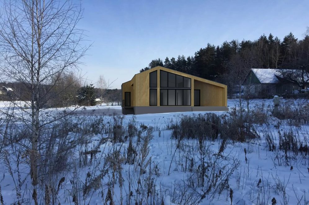 Этот проект для семьи из 4-5 человек выполнен в лучших традициях стиля барнхаус. Его отличает строгая геометрия форм, отсутствие пристроек и архитектурных излишеств, панорамное остекление, как например в этом загородном доме AET-010 с просторной террасой, двускатная крыша без свесов и натуральные цвета в отделке фасадов.