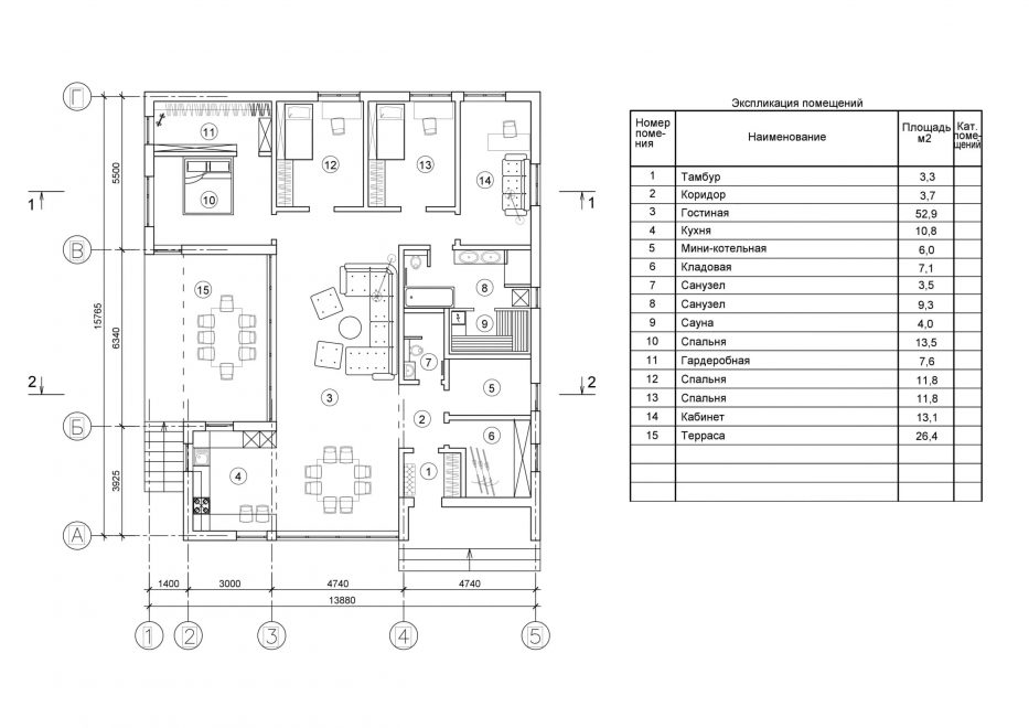 Приватная зона дома включает в себя четыре спальни — одну большую (с изолированной гардеробной) и три малых. Разумеется, любое из этих помещений может быть переделано в кабинет, мастерскую, домашний кинотеатр и проч. Безусловным достоинством дома является сауна с собственным санузлом.